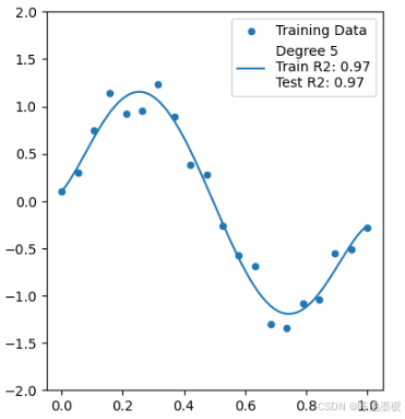 5阶多项式(适度拟合):较好地捕捉了趋势,测试分数最高