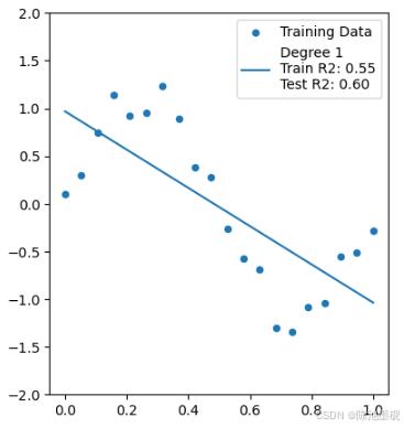 1阶多项式(欠拟合):无法拟合正弦曲线,训练/测试分数均低