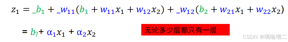 最简单的神经网络,没有激活函数,只能进行线性运算。单纯的线性运算无论有多少层,都可以通过化简变成y=wx+b的简单形式,没有意义。