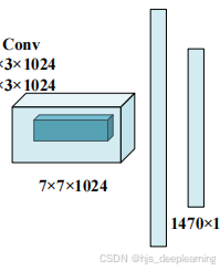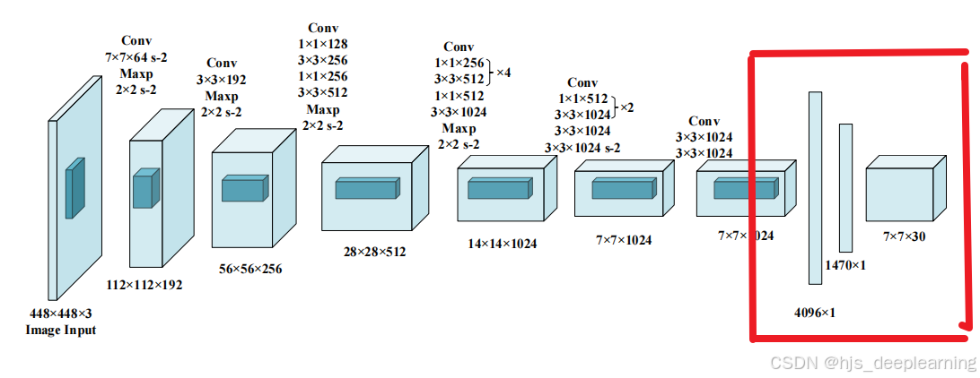 其实这块就叫做YOLOv1的全连接层。其实YOLOv1的网络结构是借鉴了GoogleNet的,输入图像的尺寸为448×448,经过24个卷积层,2个全连接的层(FC),最后在reshape操作,输出的特征图大小为7×7×30。(4)综上所述,因此每个grid cell输出的数据维度为30×1,而7×7个方格输出的维度即为7×7×30。全连接层之前,特征已经被打乱了,原来好好的照片被叠成了一个砖块,
