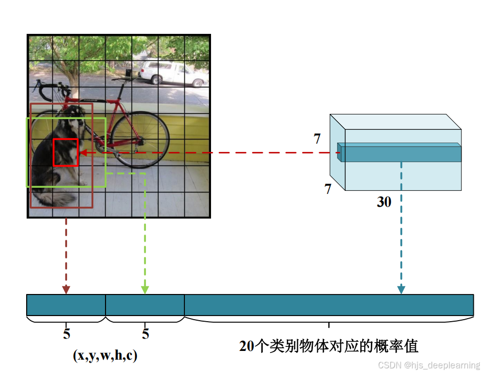 (4)综上所述,因此每个grid cell输出的数据维度为30×1,而7×7个方格输出的维度即为7×7×30。 即为最终yolov1输出结果。
