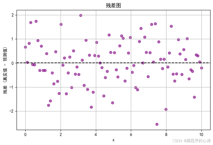 理想情况下,残差应当随机散布在 0 附近,不呈现明显的规律。如果残差图中存在系统性的模式,可能表明模型存在欠拟合或其他问题。