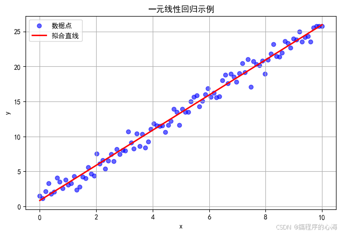 下面的代码示例展示如何用 Python 实现一元线性回归,并绘制散点图和拟合直线的图示