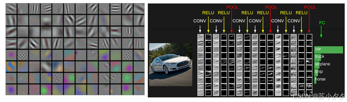 高层卷积核提取:眼睛、轮胎、文字等高层语义特征。