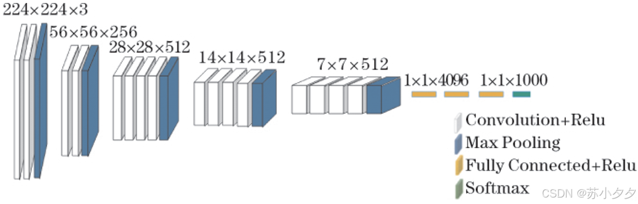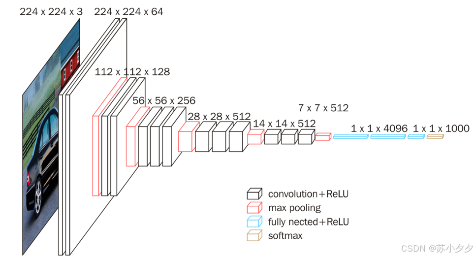 VGG网络分为VGG19、VGG16(以上图为VGG19),VGG19是有16个卷积层和3个全连接层,此外,还有5个最大池化层分布在不同的卷积层中。