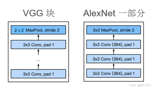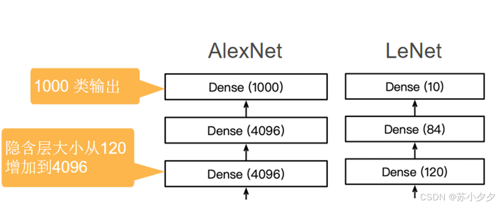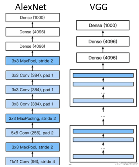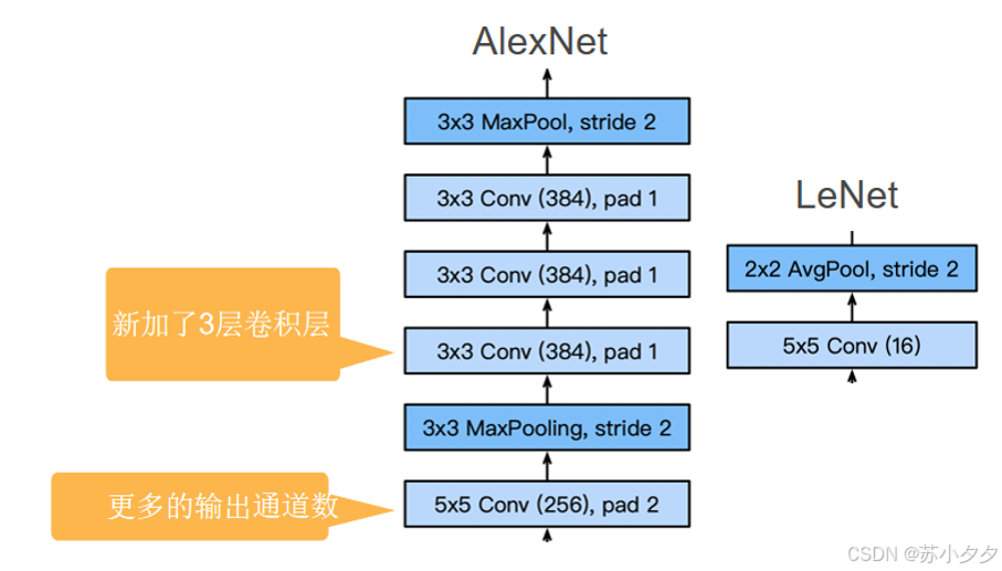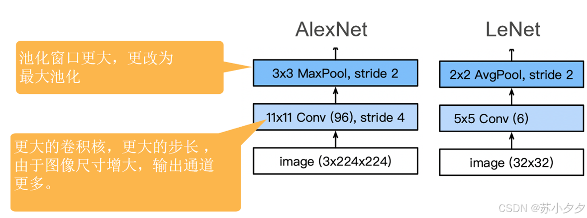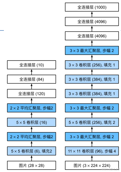 二者对比:AlexNet的池化窗口更大,拥有更大的卷积核、更大的步长、更多的输出通道