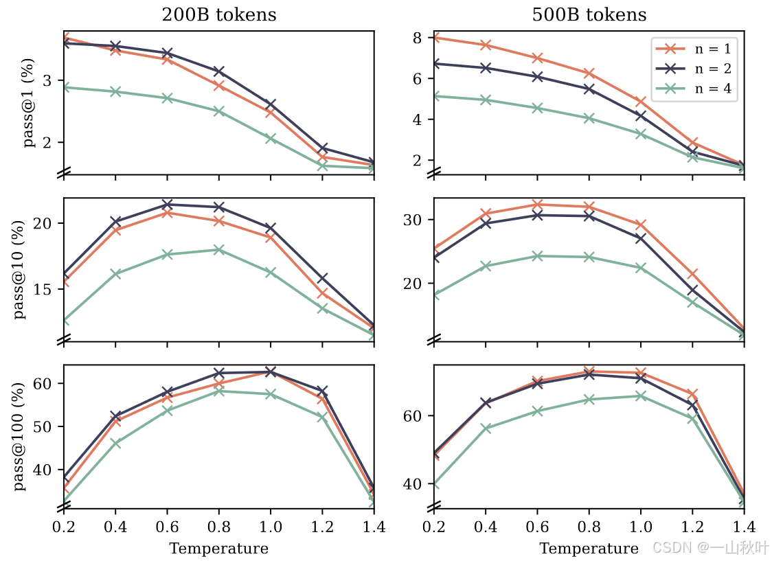 对于自然语言数学任务,作者对在GSM8K数据集上以8-shot模式预训练的模型进行评估,测量了由少量样本引发一连串思考后产生的最终答案的准确性,就像编程任务那样,用pass@k指标来量化答案的多样性和正确性。采样温度在0.2到1.4之间。下图结果显示,训练数据量为200B token时,n=2模型明显优于next-token,但在500B token时形式反转,而n=4的表现就一直很差劲了。