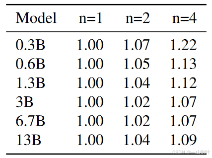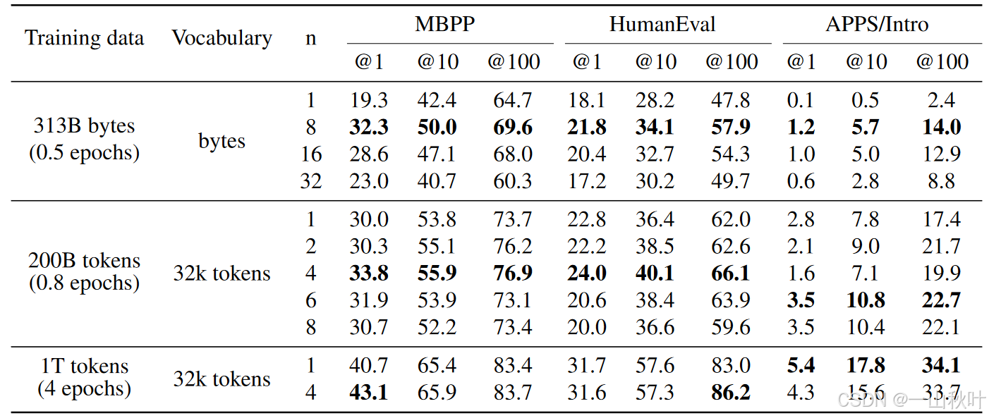 作者对用200B 代码token训练出来的7B模型进行消融实验,尝试设置n=1、2、4、6、8,结果就看下图中的Training data=200B tokens那一行,在MBPP和HumanEval数据集上,一次预测未来4个token表现最好,而在APPS/Intro数据集上,n=6的设置可以分别领先0.7%、3.0%和5.3%,很可能是最优窗口大小取决于输入数据的分布啦。不过对于字节级别的模型就比较固定了,n=8时的表现在Vocabulary=bytes那一行一直稳定在最佳。