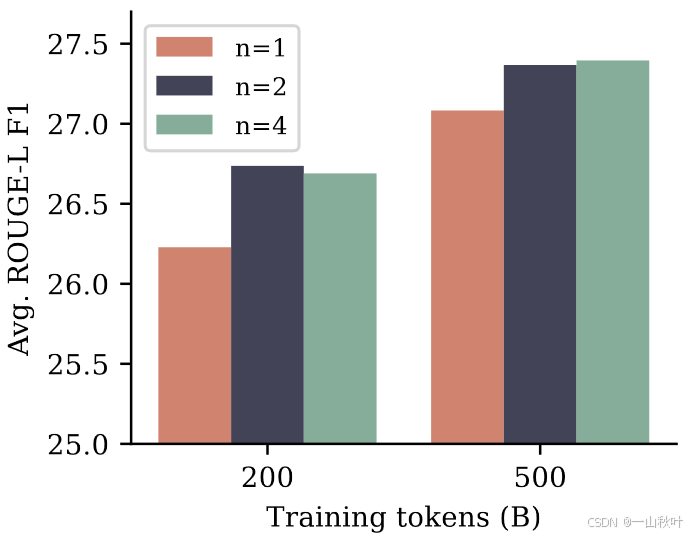 分配给了“不甚重要点”,确保模型在训练时更加关注这些不易预测的转换。生成文本质量如何取决于能否正确挑出“选择点”,而n-token预测损失正好有助于此。