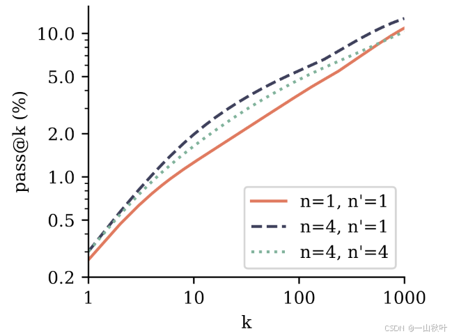 实验设置:为每个测试问题生成1000个样本,涉及5个不同的温度,在每个k值下,记录能达到最大pass@k的最佳温度T,形成一个“温度Oracle”,图中展示的就是特定k值下能达到的最大pass@k。