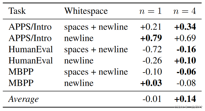 作者又以同样的想法,在HumanEval和MBPP(前文提到过的 code benchmarks)的prompts中通过添加空格和新行的方法,稍微自然地引入暂停token,从结果来看,多token预测在使用这个额外提供的计算资源上稍有优势,但微乎其微。