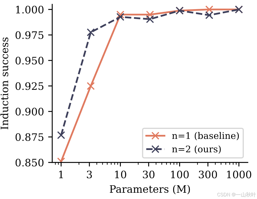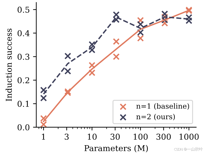 实验训练超90个epoch,根据测试指标的表现决定是否提前停止训练(epoch oracle)。实验结果如下图,通过预测名字中第二个token的准确度来衡量模型的归纳能力,每个模型大小下用不同的随机种子运行两次(一列两个同色×),线条上是两次损失的均值。在30M及以下的小模型中,2-token的性能提升还是很明显的,但在100M及以上模型中优势就消失了(额外说明:最佳分数是达不到的,测试集中的名字在训练集中就没出现过)。