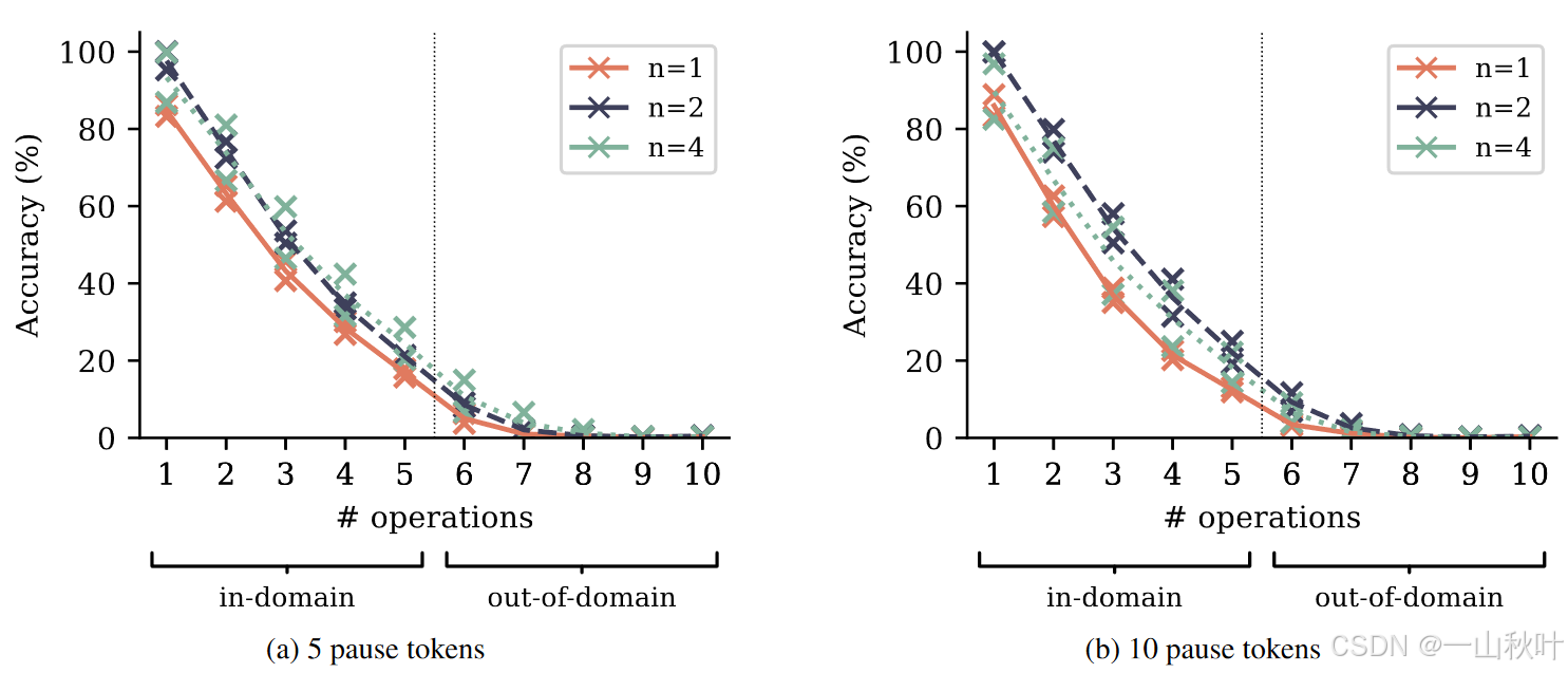 为了检验上述假说的真实性,作者在多项式算术任务基础上将不同数量的暂停token插在问题和标志答案开始的token之间,使模型在产生答案之前能进行更深入的推理,利用这些“暂停”进行全面的分析,为后续提供额外的计算资源。按照计算共享假说,多token预测在学习信息共享和计算共享上更具优势,也许能比next-token更好地利用这些资源。