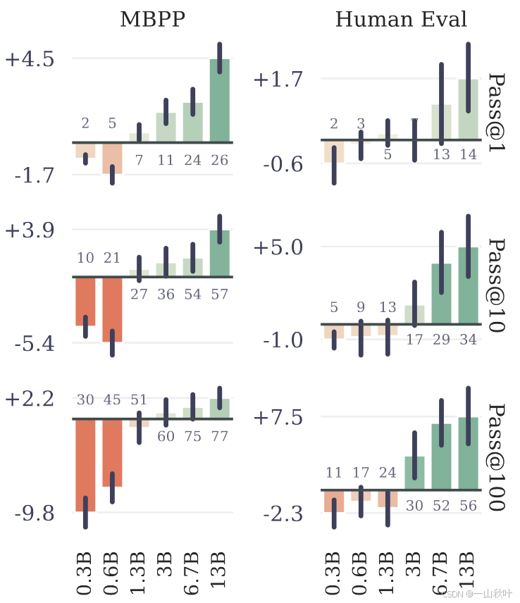图中的评价指标有pass@1、pass@10和pass@100,用于评估在特定测试条件下,模型生成代码的正确性和有效性。 条状代表相较于基线的表现好坏,绿色更牛,红色更逊,长度表程度。黑粗的延伸线是误差条,代表数据点用自助法(bootstrapping,一种统计重采样方法)算出来的90%的置信区间,其上下延申的范围代表数据点真实值可能的落点。