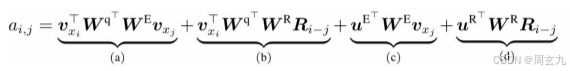 内容相关的位置偏置(b):计算查询xi的内容与键xj的位置编码之间的关联信息,表示两者的相对位置信息,表示取R中的第i−j行;