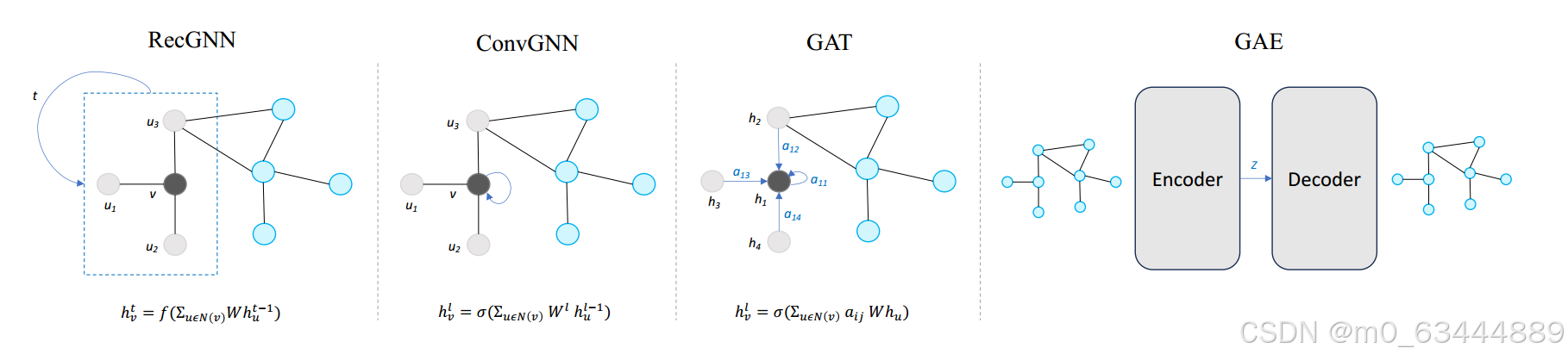 这里,通常是一个简单的元素激活,如ReLU、tanh或sigmoid。这种简单的激活通常用于在节点表示中引入非线性和捕获复杂模式。然而,这可以被循环更新函数所取代,循环更新函数使用门控机制,如LSTM(长短期记忆)[42]或GRU(门控循环单元)[43]单元。在这种情况下,将使用LSTM或GRU单元计算每个节点的隐藏状态更新,这比简单的元素激活函数更复杂和复杂。这些单元确定节点