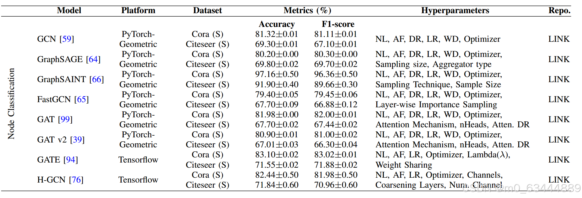 表8.使用节点分类进行评估的已发表文献中的可比模型。