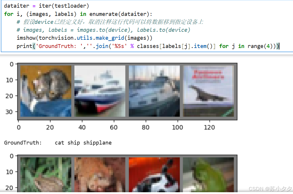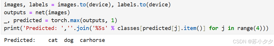 将图像数据以及标签数据利用设备device来进行计算,将数据输入到模型net中,调用net(images),通过前向传播(正向传播)来进行对图像数据的处理并输出;torch.max是用于在指定维度上找到张量的最大值,1表示是在维度1上进行操作,该代码会返回两个值,一个是样本最大值(用占位符来接收),一个是predicted每个样本预测的类型索引;最后输出打印前四个样本元素类型。