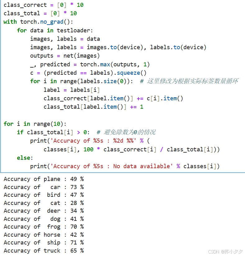 这段代码是计算输出一个分类模型在测试集上,创建两个长度为10的列表,分别记录每个类别预测正确的样本数和每个类别样本的总数量,关闭了梯度计算,第一个for循环遍历测试数据加载器,第二个for循环统计每个类别的正确预测数和总数,第三个for循环是计算并输出每个类别的准确率,发现10个样本中,准确率最高的是car,为73%,最低的是cat-28%