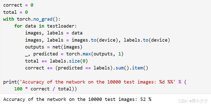 这段代码是用于评估对于已经训练好的神经网络的准确率,correct是用于记录预测正确的样本数量,所以初始值为0,total是用于记录测试集中样本总数,所以初始值为0;for循环是遍历测试数据加载器testloader;从testloader中取出一个批次的数据,data是一个包含输入图像和对应标签的元组,将图像数据赋值给images,标签数据赋值给labels;total是当前样本数量累加和,之后计算预测正确的并进行对预测值的打印。