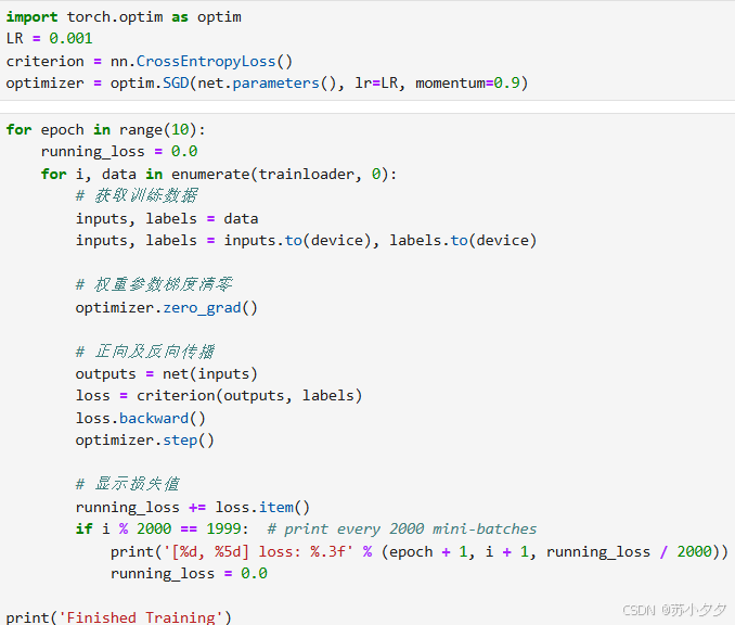 for循环,通过迭代i来进行对images(图像)和labels(标签)的返回数据;device是利用GPU或CPU来加速计算。