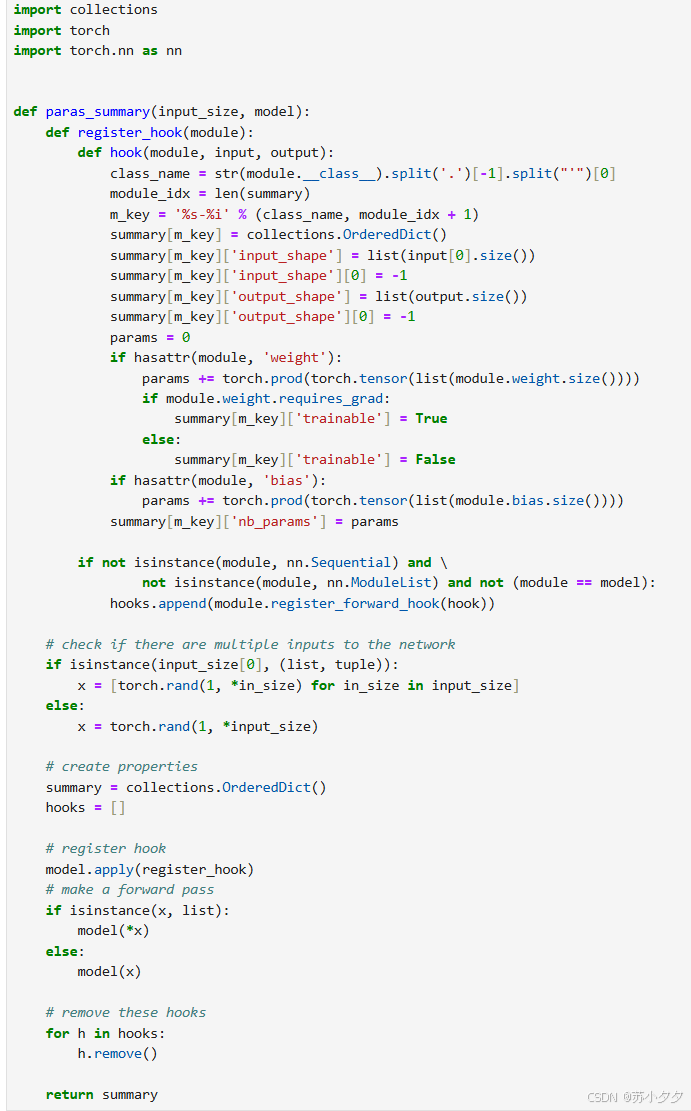 这段代码是定义了一个函数,用于生成神经网络模型的参数摘要信息,包括每一层的输入形状、输出形状、参数数量以及是否可训练等