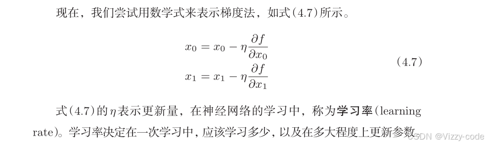 参数 f 是要进行最优化的函数,init_x 是初始值,lr 是学习率 learningrate,step_num 是梯度法的重复次数。numerical_gradient(f,x) 会求函数的梯度,用该梯度乘以学习率得到的值进行更新操作,由 step_num 指定重复的次数。