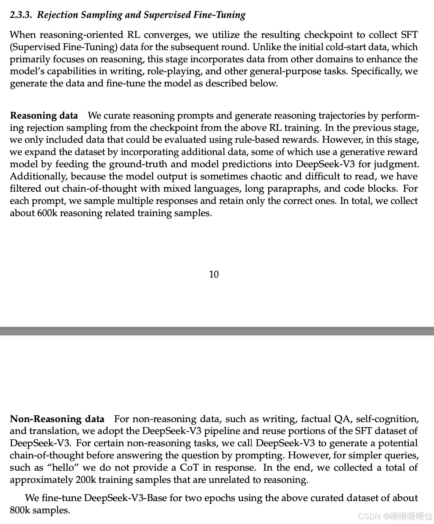 拒绝采样和监督微调工作:在RL训练过程中,当快要收敛时,会使用CKPT去收集下一轮的数据。过程就是基于checpoint断点进行拒绝采样,生成了很多推理的轨迹,生成了推理的数据,这里还有非推理的数据为了应对一些简单的问题。