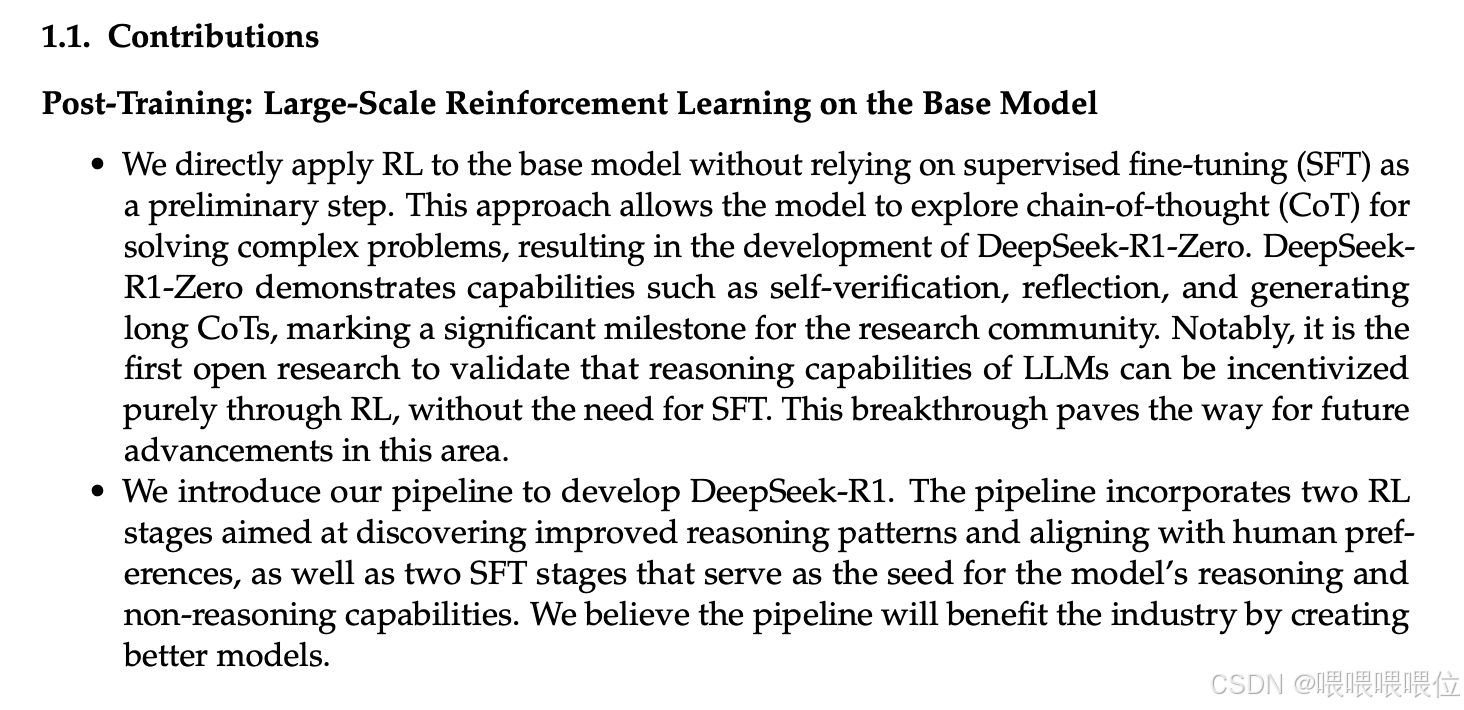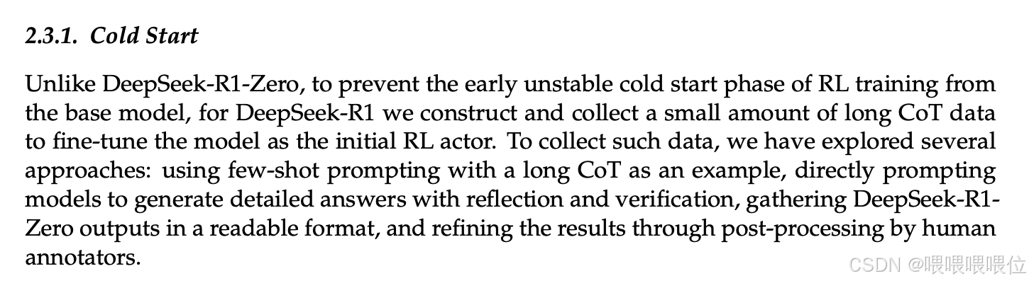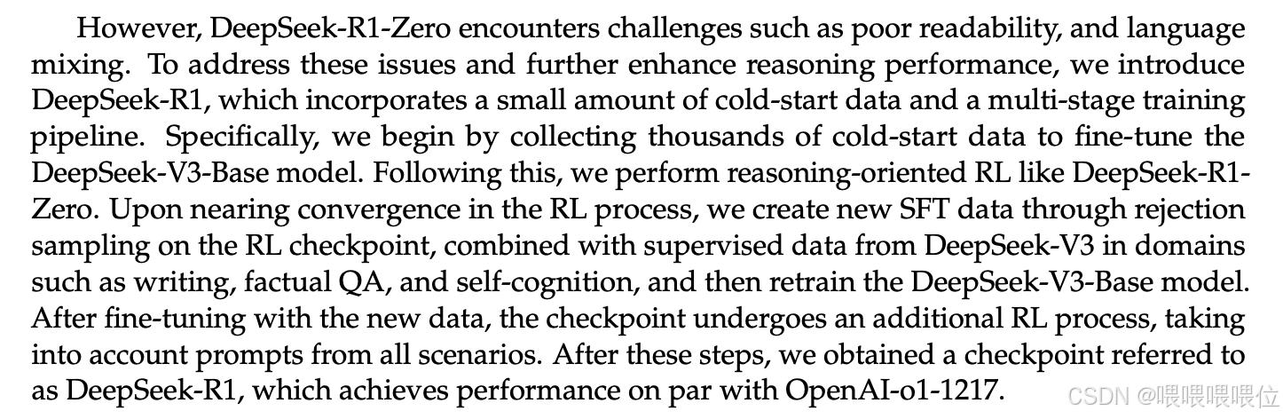 于是有了DS-R1,在强化学习之前,先加入了冷启动数据进行微调(SFT),让模型从一开始就具备基础的语言和推理能力,之后再用强化学习优化推理能力。这样可以减少 R1-Zero 版本的缺点,提高回答质量和可读性。DS-R1还有多阶段训练这一特征。还是用了一些SFT数据进行后处理(Post-Training)。