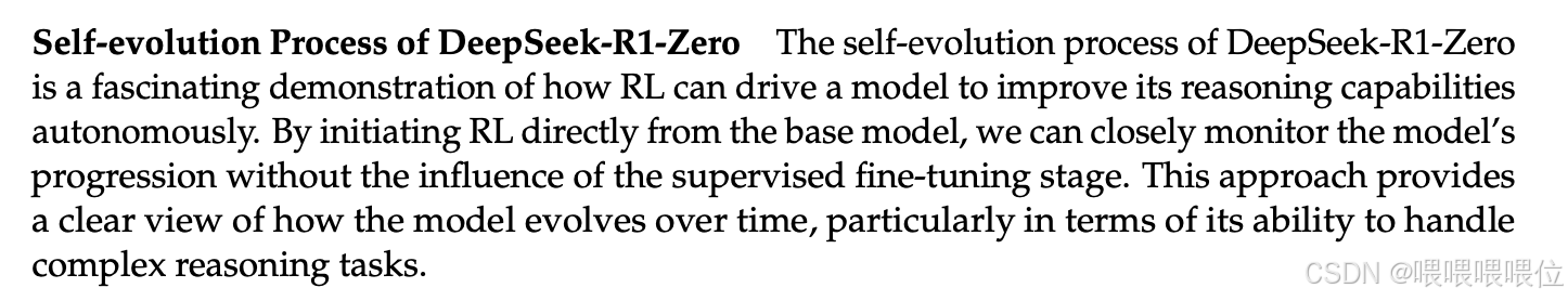 整个模型有个self-evolution的过程,使得RL可以让一个模型自动提升其推理能力。使用RL初始化base model,我们可以近距离观察模型的进化而不使用SFT阶段。这种方法提供了模型如何随时间演变的清晰视图,特别是在其处理复杂推理任务的能力方面,即在R1的训练过程中,随着时间的推移,R1自我思考的时间越来越长,就有了越来越好的推理能力,这就是自我整体进化的过程。