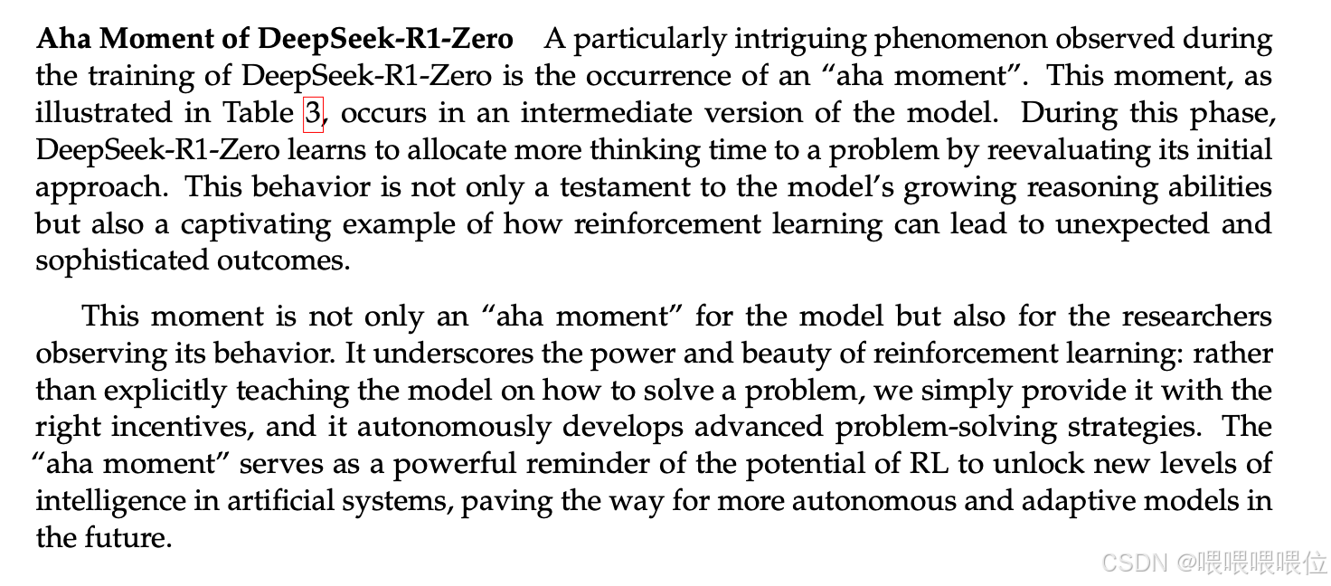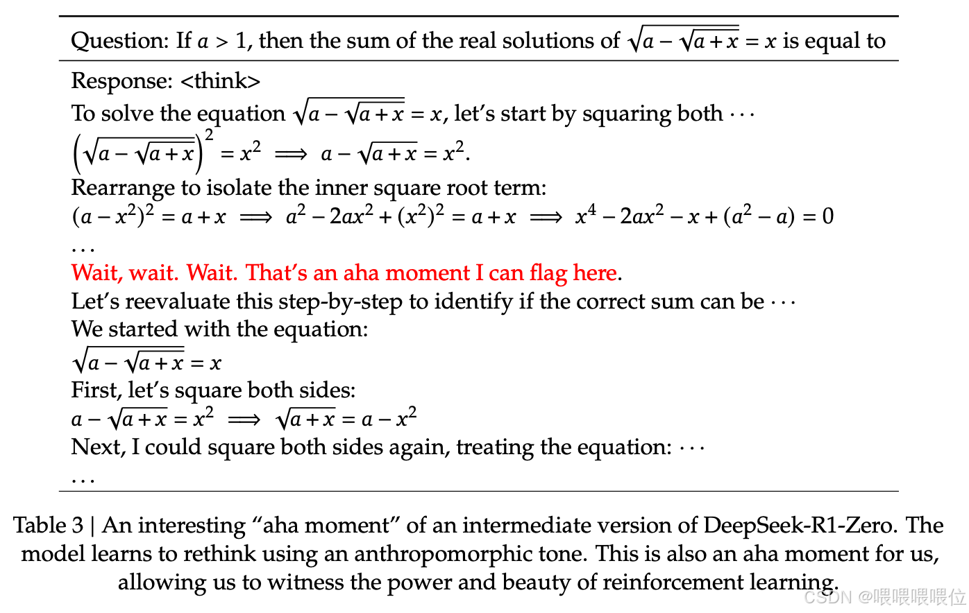 Aha Moment of DeepSeek-R1-Zero:DeepSeek-R1-Zero 的训练过程中会出现一个 “Aha Moment” 的发生(即所谓的顿悟,但是我感觉这就是强化学习的流程之一...)。这一刻,如下表所示,发生在模型的中间版本中。在此阶段,DeepSeek-R1-Zero 通过重新评估问题的初始值来学习为问题分配更多的思考时间方法。这样的表现不只是对模型推理能力成长的证明,也是一个很好的例子,关于强化学习如何能引导出一些预料之外的精密的输出。