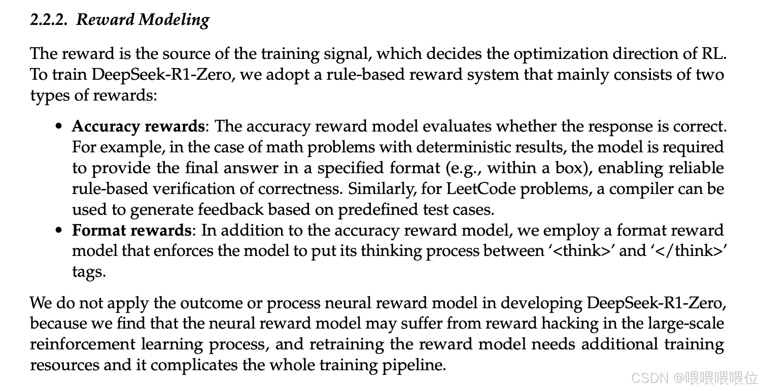 接下来是最关键的奖励机制:1. Accuracy rewards;2. Format rewards。准确性奖励用来评估模型的回答是否正确;格式的奖励强制大模型将思考的过程放置于<think>和</think>之间。并没有使用一个结果或者过程的奖励,因为在实际过程中如果这么奖励会出现reward hacking,会陷入一个被动的不断推理的过程。
