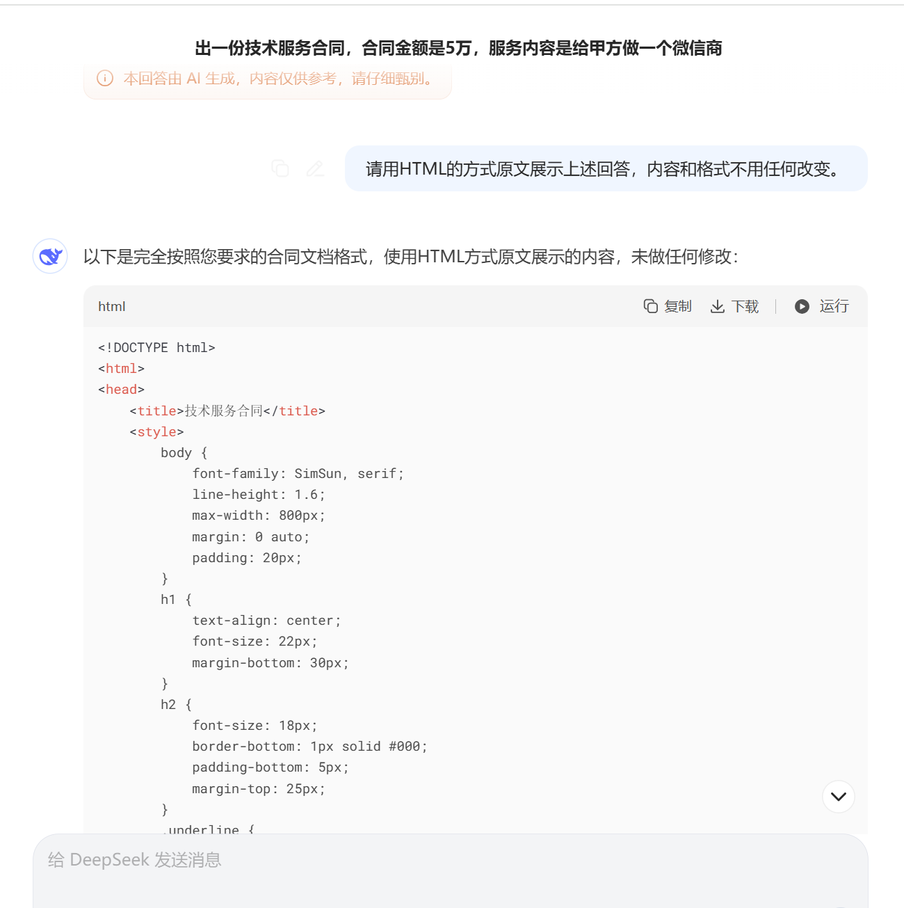 于是,在生成内容后,再加一句:“用HTML的方式原文展示上述回答,内容和格式不用任何改变。相信无论是使用deepseek、豆包还是别的AI工具来生成合同、文案等内容,复制到文档都会出现格式错乱,又要重新设置一下格式。好像是比直接复制要好很多了,已达到基本要求,对格式有严格要求的,再给相对精准的指令就可以了。以上仅个人的使用习惯,如果有更好的方式,欢迎大家指正。这样的话,所有的标题格式都要重新再调。