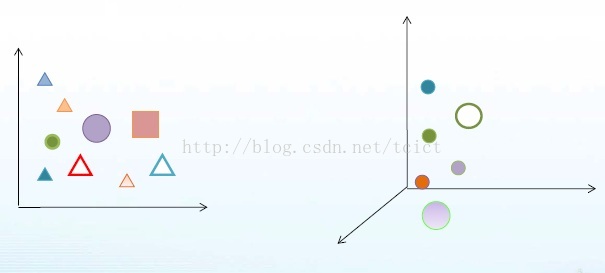 当维度超过三维后,可以增加视觉编码来表示,例如颜色、大小、形状、填充形式等。但对于更高维多元数据的可视化,这种方法还是很局限。