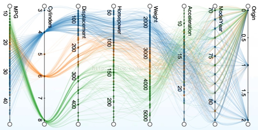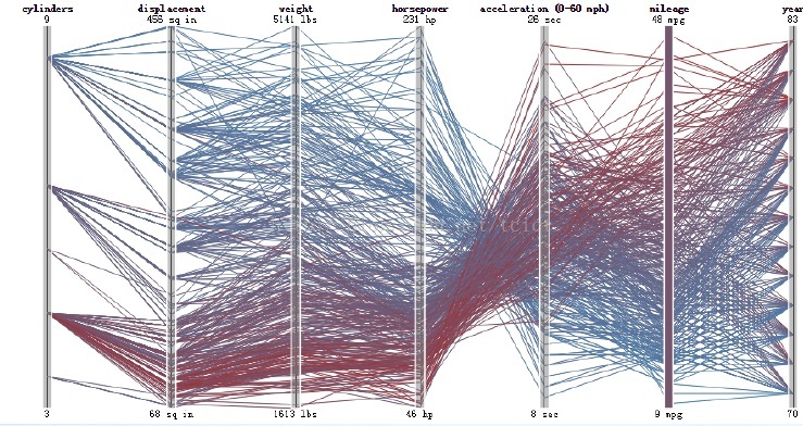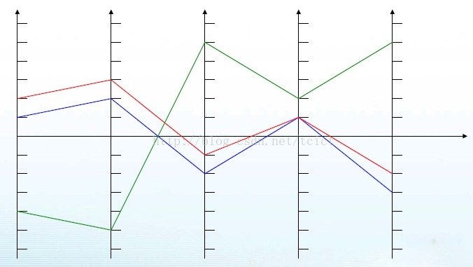 - 每个数据点对应一条穿过所有坐标轴的折线