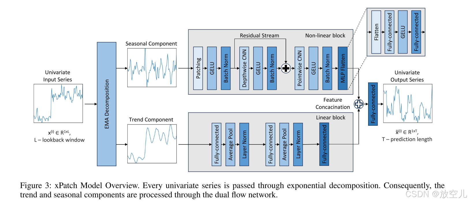 - xPatch采用了基于MLP的线性流和基于CNN的非线性流的双流架构。这种组合不仅能够捕捉时间序列中的线性关系,还能处理复杂的非线性模式。通过这种方式,模型可以在不同层次上提取特征,进一步提升预测性能。