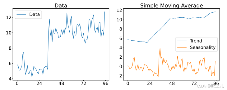 在ETTh1数据集的96长度样本上使用内核k = 25进行SMA分解的示例。