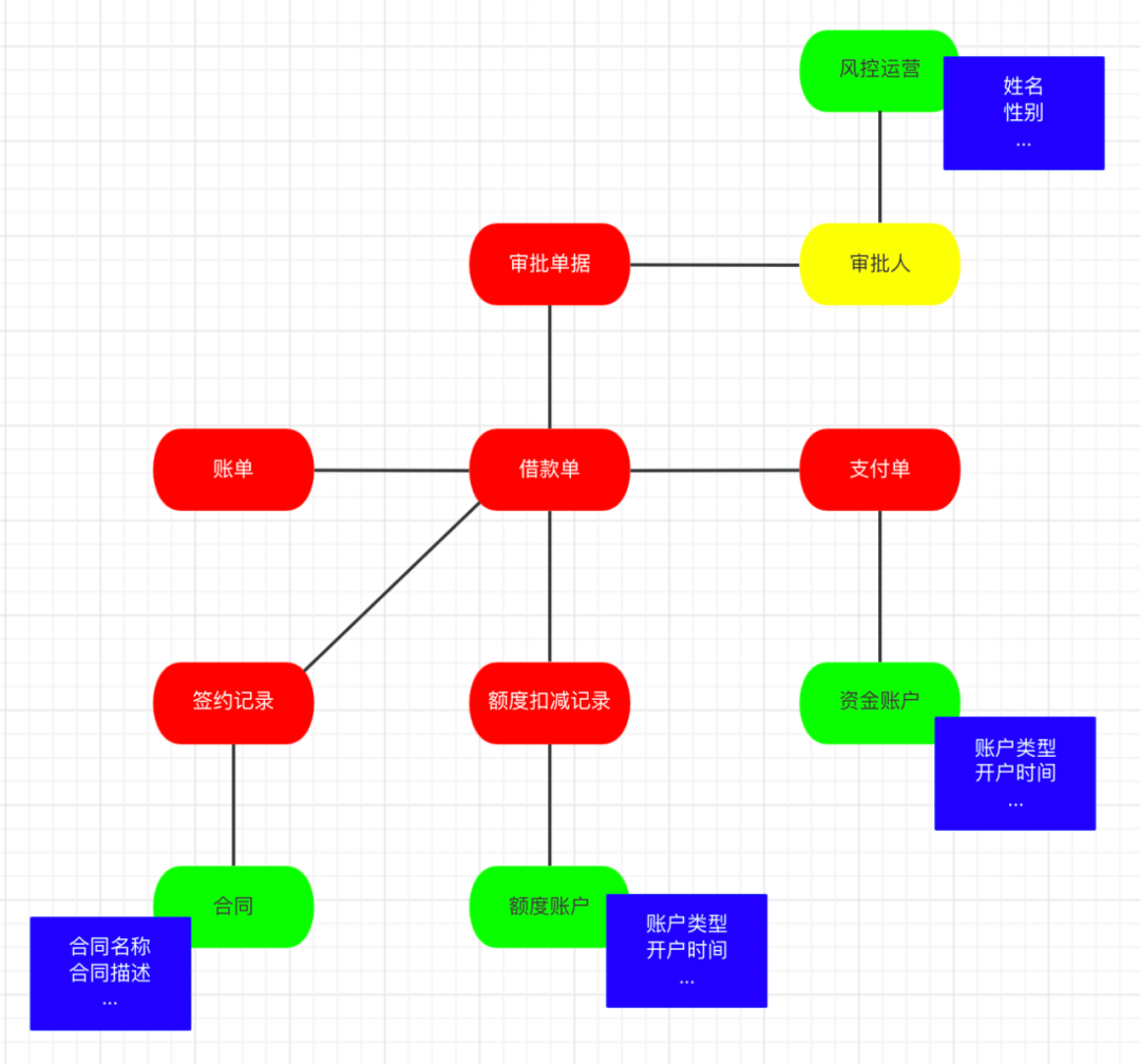 首选我们从业务流程中尝试寻找时标对象(用红色表示),可以认为是核心业务单据。此类对象是发生的事实,当出现问题的时候可以追溯。我们从上述业务流程可以分析得出,借款申请对应借款单,借款审批对应审批单据,额度扣减对应额度扣减记录,签署合同对应签约记录,生成还款计划对应账单,放款对应支付单。在找到时标对象后尝试寻找参与方(用绿色表示),一般可以是人、物、地点等。这里参与方包含风控运营、额度账户、资金账户、合同等。之后再分析参与方是以什么角色参与到业务流程中的(用黄色表示),风控运营是以审批人角色参与到业务中的。最后尝试给参与方添加一些描述信息(用蓝色表示),使其更具象。根据上述方法画图如下: