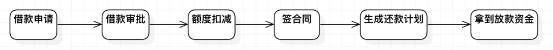 我们以借款流程为例,假设通过以上方法我们梳理出了信贷核心的借款流程。用户提出借款申请,风控运营人员审批通过后,系统扣减对应的用户额度,之后用户签署借款合同,系统生成对应的还款计划并放款到用户的账户。其流程大致如下: