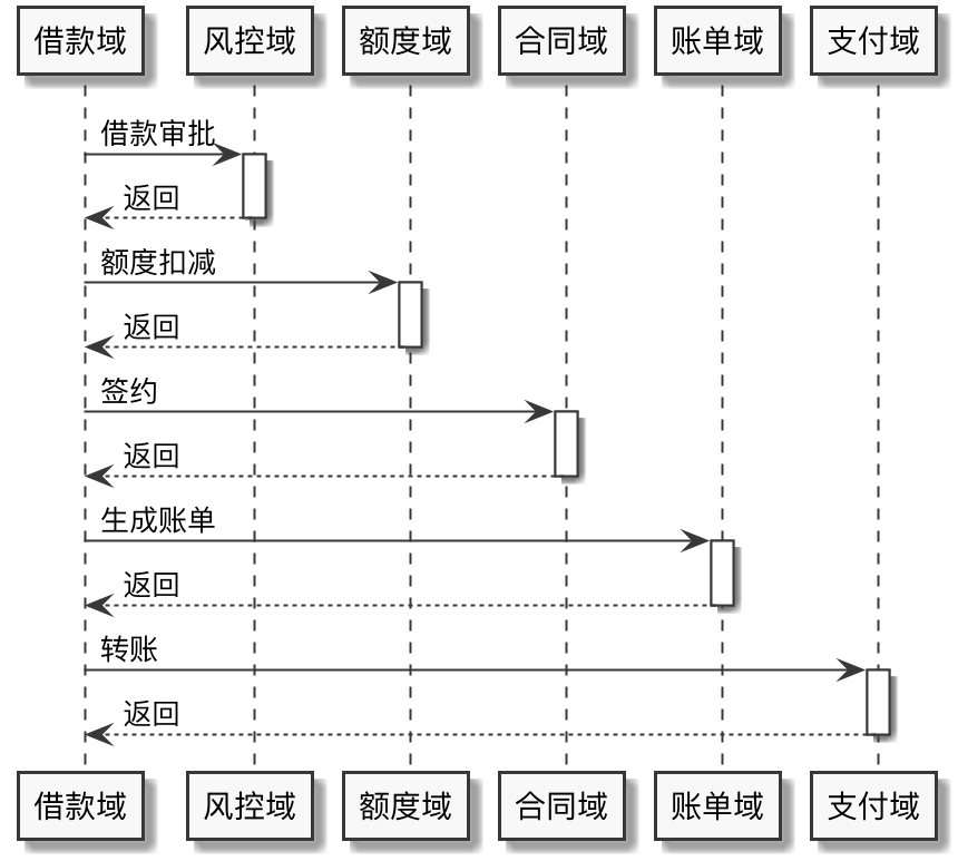 至此一个借款流程的领域模型就拆分成了一些小的领域,现在开始可以针对每个领域逐一进行详细设计。我们可以借助用例图、流程图等。