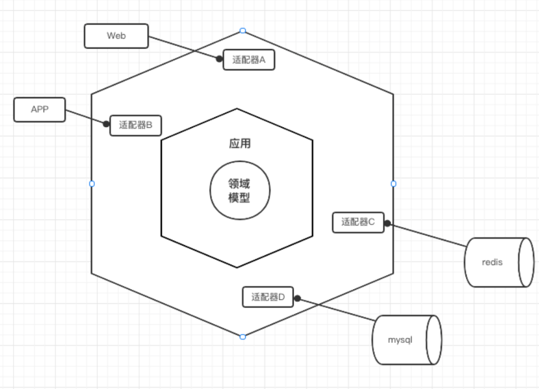 在设计完成后就开始进入代码落地阶段,落地前需要确认好系统分层。分层的目的是使其结构清晰,便于后期维护。一般分层架构分为严格和松散两种。区别是严格分层只与其直接下层发生耦合,而松散分层是允许任意下层发生耦合。DDD有三种比较经典的分层架构,四层架构、五层架构和六边形架构。六边形架构通过适配器的方式与外部交互,将应用与领域模型封装在系统内部。保证核心领域不受外部干扰的同时,端口的可替换性也可以很方便的对接外部系统。其架构图如下: