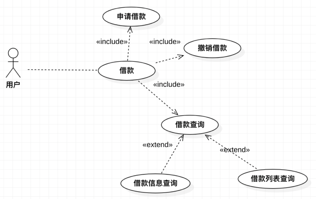 用例图主要用来描述参与者与用例之间的交互,用例与用例之间的关系及系统的边界。说明的是谁使用系统,以及使用系统干什么事情。我们以借款为例,用例图如下:
