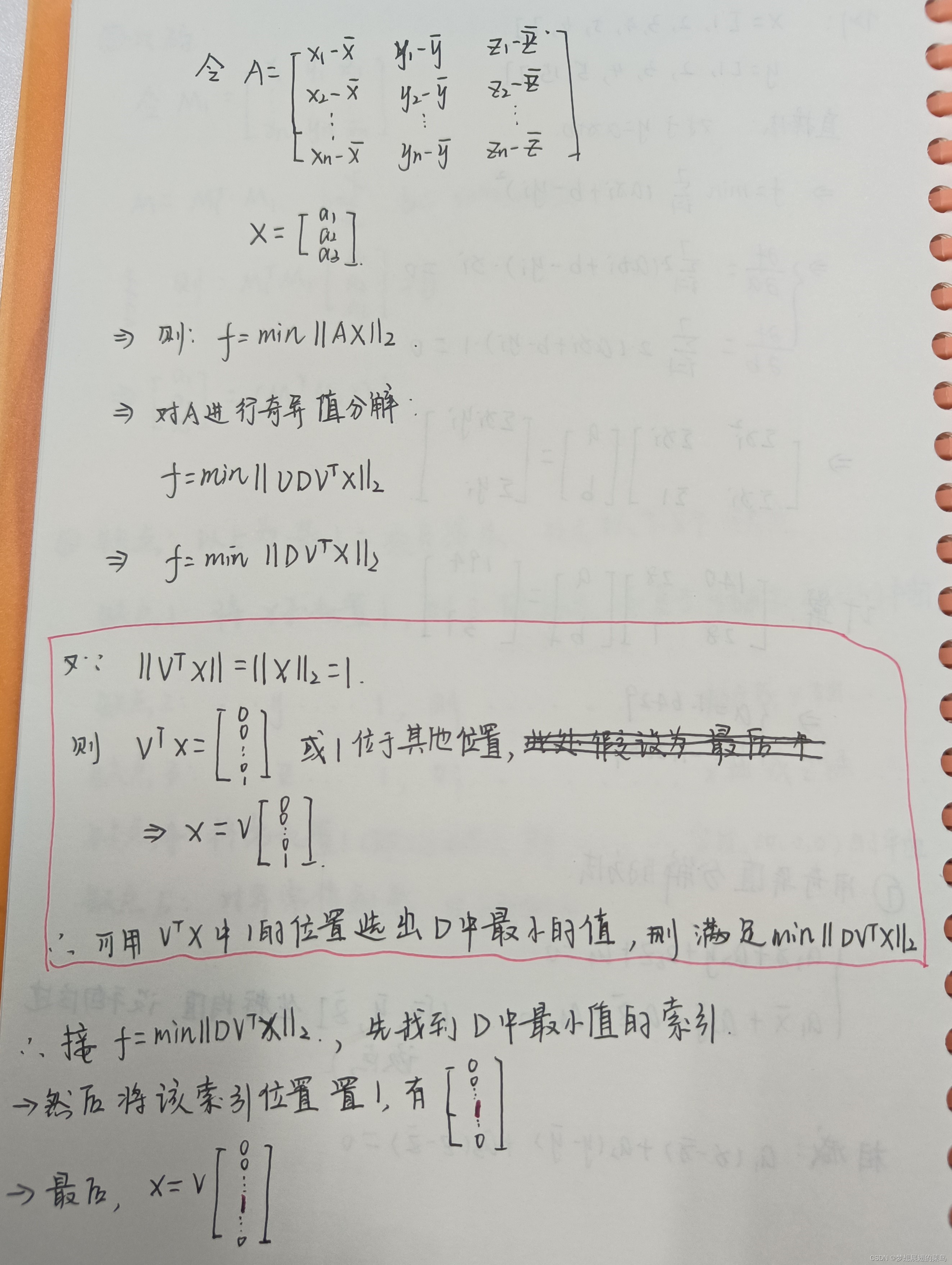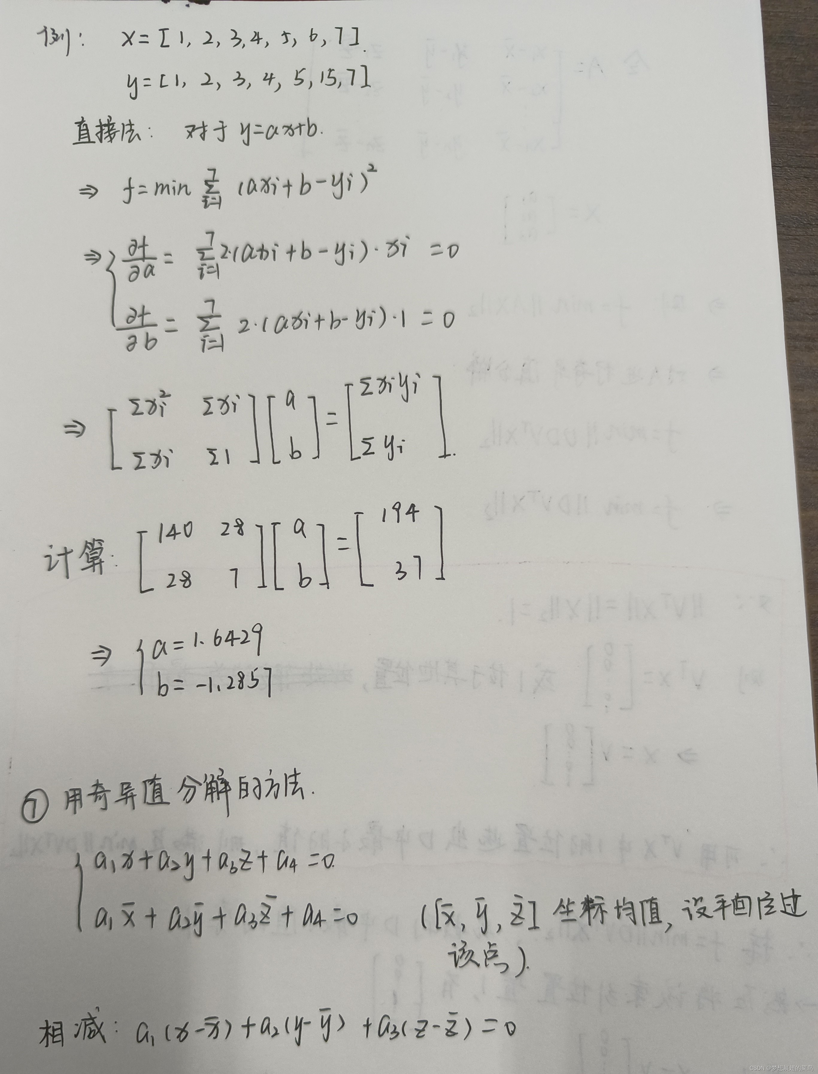 以下内容为我的手写笔记。包括:最小二乘直接法理论推导、直接法的缺点、最小二乘奇异值分解法三个部分。