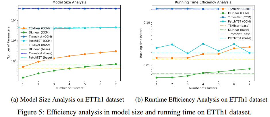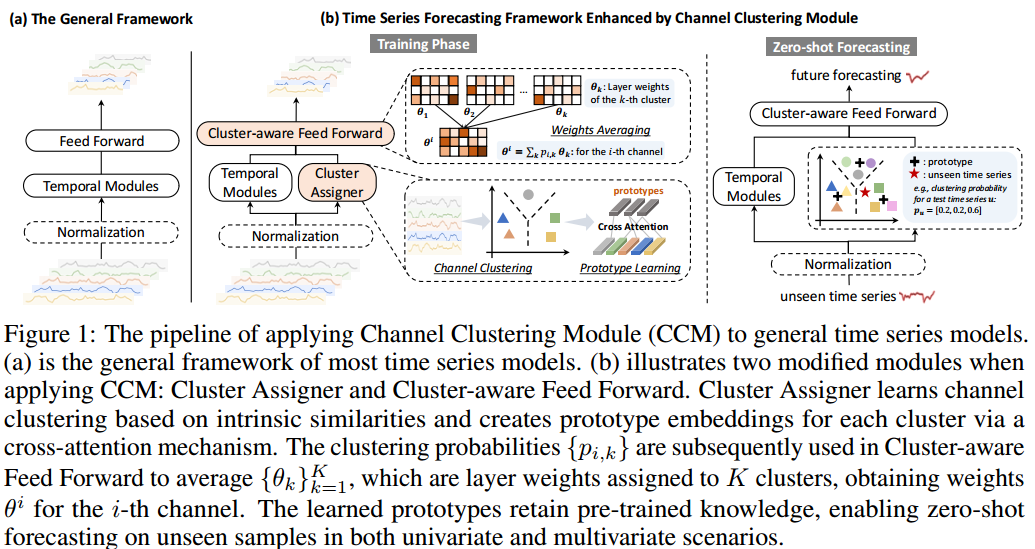 - 模型结构:现有的时间序列模型通常由三个核心部分组成:(1)可选的归一化层(如RevIN);(2)以线性层、基于Transformer或卷积为backbone的时序模块;(3)预测未来值的前馈层。本文提出的CCM在时序模块之前加入了聚类分配器,然后是聚类感知前馈层。聚类分配器根据内在相似性实现通道聚类,并采用交叉关注机制为每个聚类生成原型,从而存储来自训练集的知识,并赋予模型零点预测能力。