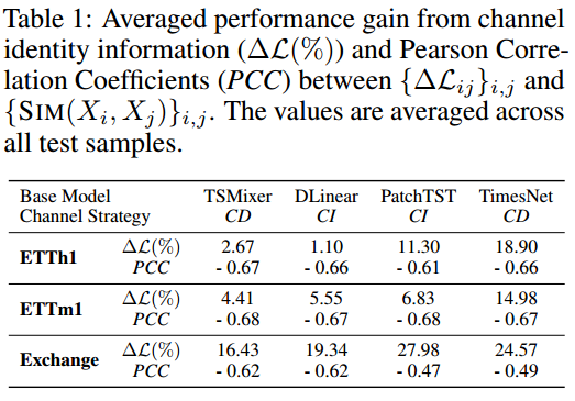 论文选取了四个基线模型进行实验:1)在所有通道上训练时间序列模型,并评估测试集上的通道平均平方误差 (MSE) 损失;2)在训练模型的同时在每个批次中随机调整通道。这意味着对于 CD 和 CI 模型,通道身份信息将被移除。基于径向基核函数的通道相似度定义(值越大,越相似):