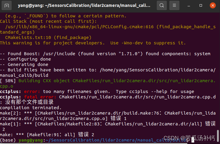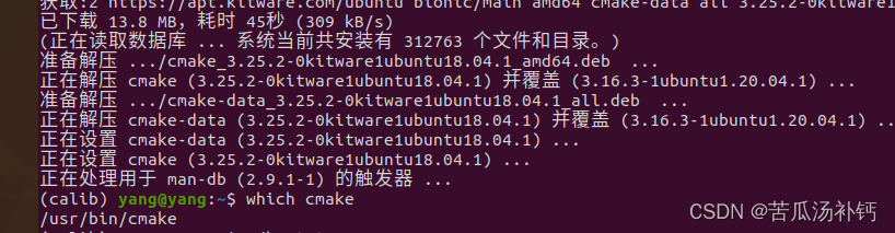 我没有把openclib整个安装下来,只装了我需要的lidar2camera,以下是安装过程。因为我开始安装的时候创建了一个calib的虚拟环境,所以无法正常运行,切换环境后即可。依次输入命令,进入刚刚下载好的源文件目录,并进行安装。通过which cmake可以查看安装的路径。