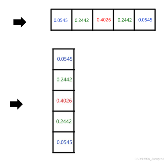 因此我们可以利用这两个一维高斯函数,得到相同的卷积核结果,一个是水平方向的,一个是竖直方向的,但是内容一致