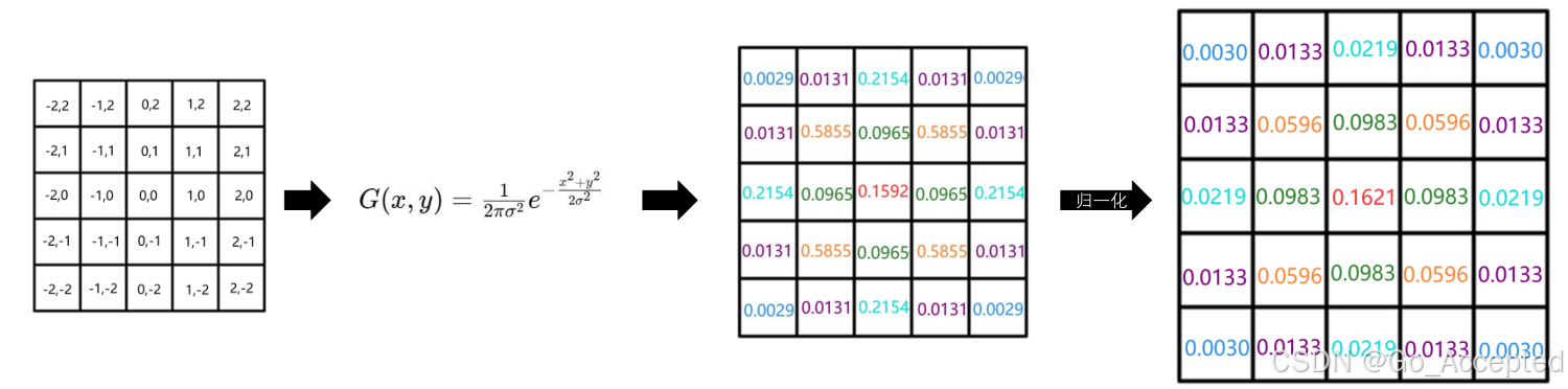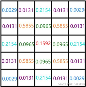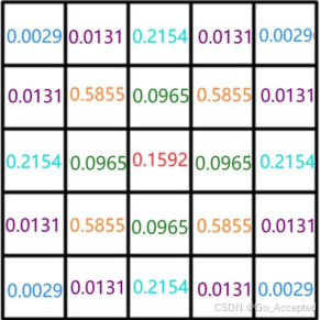 滤波核越大,模糊效果越明显,从效果和效率综合考虑,我们通常会使用 5x5 的大小,高斯滤波核中各元素的具体值,我们通过高斯函数来确定
