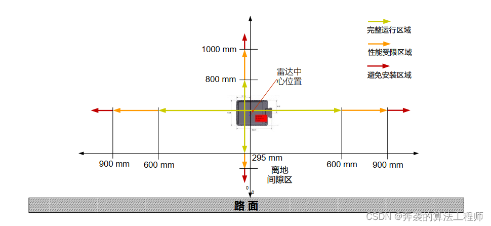 雷达安装在车辆正前方,左右偏移不超过600mm,离地高度295~800mm。