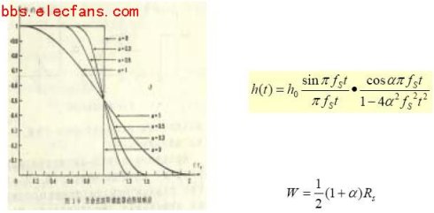 由于滚降系数α的存在,在无码间串扰条件下所需带宽 W 和码元传输速率 Rs 的关系上图右图中的表达式。